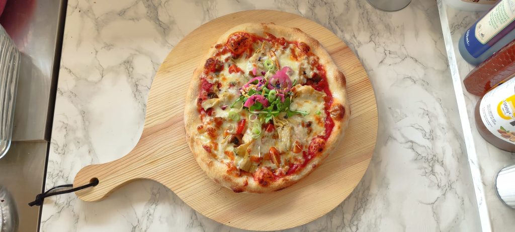 Sauce tomate, poivrons, tomates cerises, champignons, artichaut mariné, mozzarella
